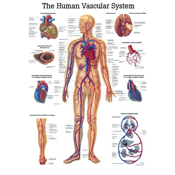 Gelamineerde, watervaste anatomische poster in kleur, voorzien van alle Latijnse benamingen. Heeft een hard plastic onder- en bovenlijst en een ophangring.